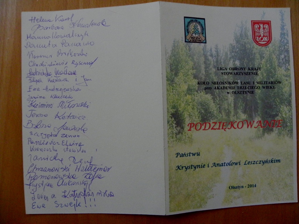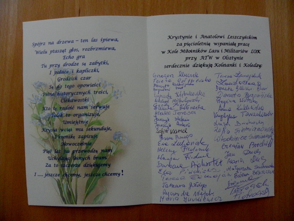 5 czerwca 2014 .r spotkaliśmy się w Regionalnej Dyrekcji Lasów Państwowych w Olsztynie i podsumowaliśmy 5 lat działalności i rozwoju naszego Koła. A mamy z czego być dumni. Z 40 osób – na początku, aktualnie jest nas 123 i ciągle przybywa. Przeszliśmy 148 rajdów i byliśmy na 33 wycieczkach. Mamy „swój las” w Nadleśnictwie Olsztyn i w Nadleśnictwie Mrągowo.Oprócz sadzenia i sprzątania lasu, każdego roku obchodzimy Święto Drzewa, Polskiej Niezapominajki, Święto Hubertusa. Rozwijamy się artystycznie, uczestniczymy w wystawach. Spotykamy się na treningach strzeleckich i rywalizujemy w trakcie zawodów organizowanych przez Koło, jak również przez organizację wojewódzką i powiatową LOK. To tylko część naszej działalności o której rozmawialiśmy na czwartkowym spotkaniu.