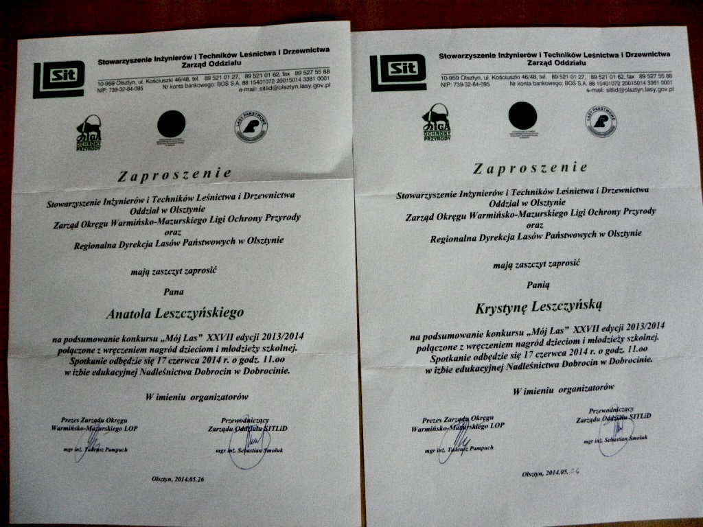 17 czerwca 2014 r, na zaproszenie RDLP w Olsztynie, Krystyna i Anatol Leszczyńscy uczestniczyli w podsumowaniu leśnego konkursu.