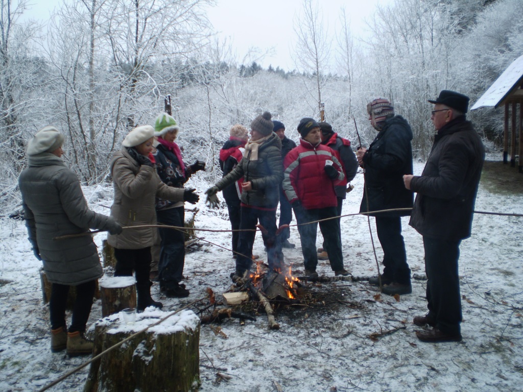 27 grudnia 18 członków Koła spotkało się w Leśnictwie Stary Dwór aby pożegnać stary rok. Trochę mroźna, ale piękna, leciutko śnieżna pogoda sprzyjała spacerowi. Przy leśnym ognisku z lampką szampana składaliśmy sobie życzenia, śpiewaliśmy kolędy. Po drodze do ogniska, mijaliśmy ubraną przez nas 13 grudnia leśną choinkę. Przekonaliśmy się, że w tym czasie leśne bractwo odwiedzało to miejsce. Ubyło sporo „ozdób” – ciasteczek, skórek ze słoninką, jabłek. Zostały marchewki i część jabłek.