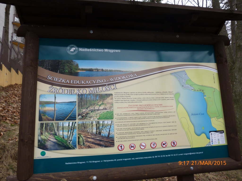 Ścieżka edukacyjno-widokowa „Źródełko Miłości” usytuowana jest przy promenadzie obok Jeziora Czos. Przygotowało ją Nadleśnictwo Mrągowo. Początek ścieżki około 200 metrów za amfiteatrem, w którym odbywają się takie imprezy jak Mazurska Noc Kabaretowa, Piknik Country, Festiwal Kultury Kresowej i wiele innych.