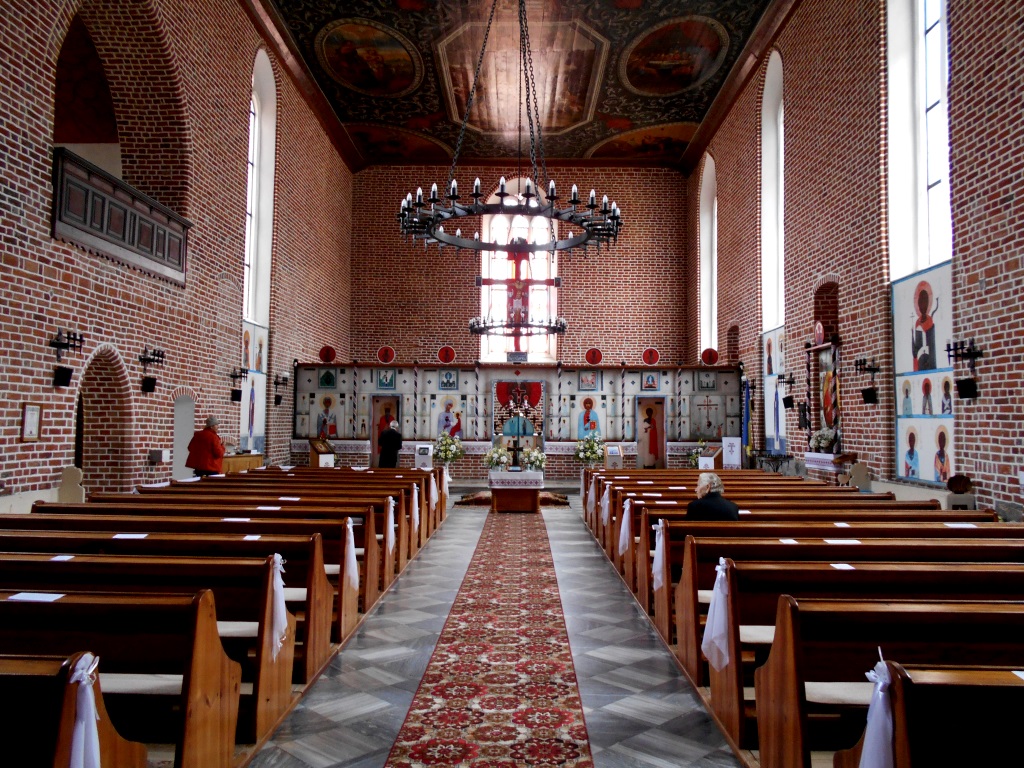 Wewnątrz zobaczyć można największe na Warmii malowidło sufitowe oraz piękny ikonostas Jerzego Nowosielskiego, jak też piękną barokową polichromię sufitową z 1660 r.