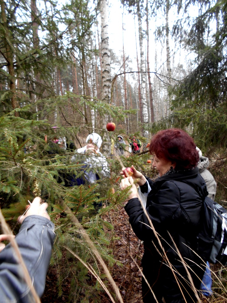 Podczas rajdu ubieraliśmy leśną choinkę: marchewkami, jabłuszkami, gruszkami, słoninką i słodyczami.