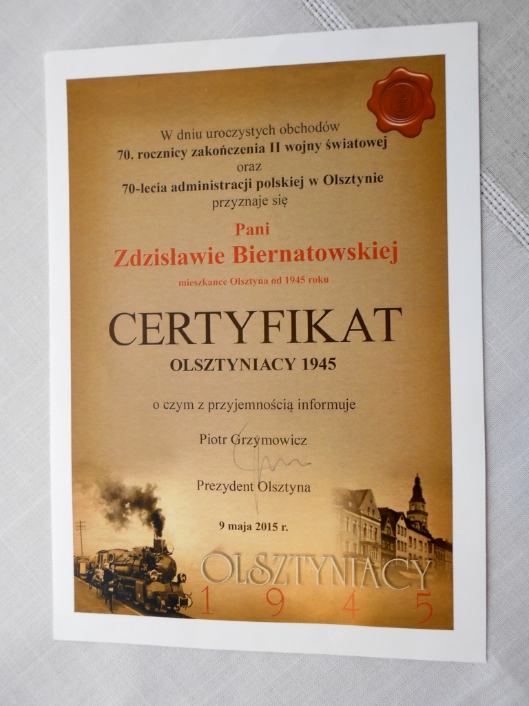 Z rąk prezydenta Grzymowicza pamiątkowy certyfikat „Olsztynianin 1945” otrzymała nasza koleżanka Zdzisia Biernatowska.