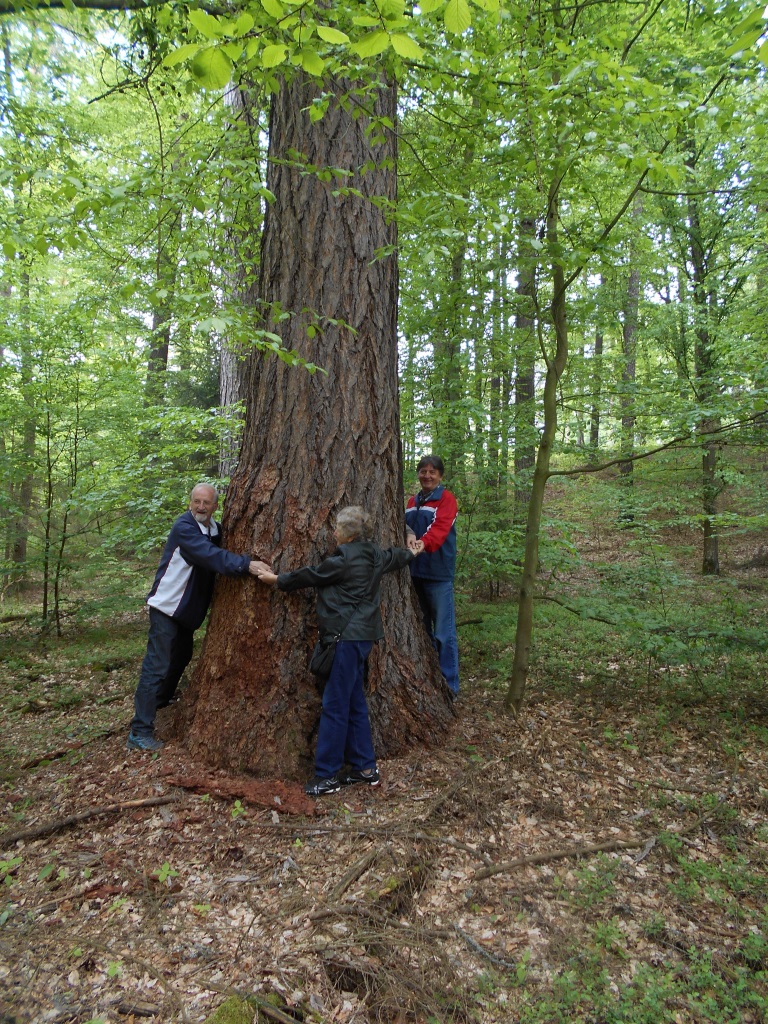 Idąc lasami Nadleśnictwa podziwialiśmy zabytkowe modrzewie, a jakie grube to widać na zdjęciu. Po drodze przechodziliśmy też koło leśnego jeziorka, wokół którego rośnie wiele ciekawych roślin, m.in rosiczka.