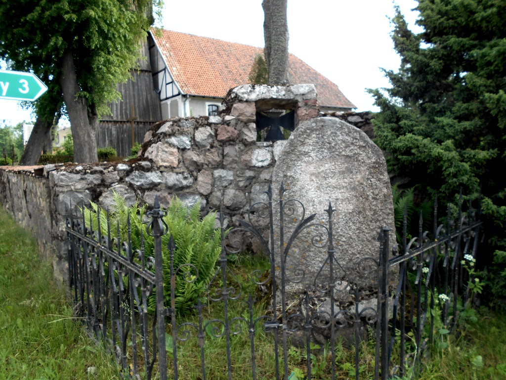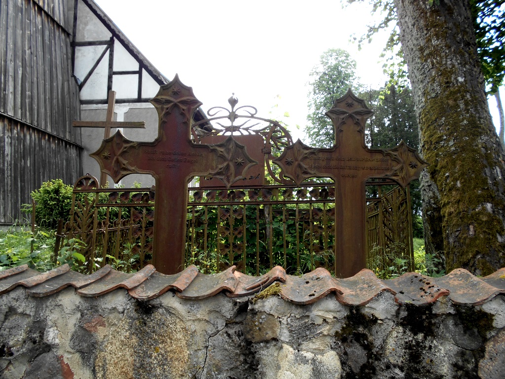 Godne uwagi jest również obejście świątyni; znajdziemy tam pozostałości starego ewangelickiego cmentarza z XIX w., z pięknymi nagrobkami starych mazurskich rodów, wykończonymi i obudowanymi żeliwnymi odlewami, opisanymi gotykiem w języku niemieckim. Na tym cmentarzu spoczywa również ostatni sprawujący tu posługę pastor, Józef Kułak, zmarły w 1987 roku. DSCN7197-www
