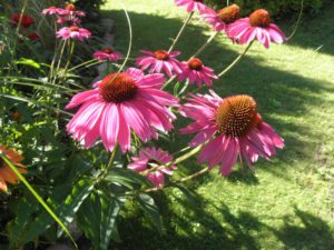 Pięknymi różowymi kwiatami zachwyciłam się wiele lat temu zwiedzając ogród botaniczny w Czechach. Oglądaliśmy tam ogrody kwiatowe, na których rosły np tylko czerwone, albo tylko białe kwiaty. Był też kwietnik różowy, na którym królowały kwiaty jeżówki. Był wrzesień, wiele kwiatów przekwitło, sypały się nasionka, których trochę przywiozłam do Polski i posiałam. Musiałam czekać dwa lata, żeby roślinki wzmocniły się i zakwitły – ale było warto.