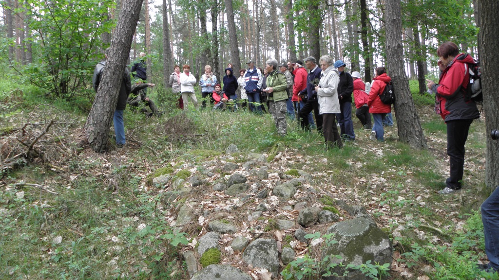 Bardzo ciekawym obiektem historycznym w tym rejonie są grobowce, które powstały w epoce brązu lub we wczesnej epoce żelaza, co na terenie Warmii i Mazur przypada na drugą połowę VII wieku p.n.e. Niespotykanym dotąd odkryciem są tu 4 „ciągi kamienne”, ułożone wzdłuż stoku i równoległe od siebie w odległości 18 lub 24 metrów. Ciągi sugerują, że miejsce to było nie tylko terenem pochówku zmarłych, ale prawdopodobnie też miejscem niezwykle ważnych obrzędów religijnych. Trochę zadumani o historii naszych ziem, przeszliśmy na polanę, na której była przygotowana przez leśników niespodzianka – ognisko, kiełbasa, bułeczki.