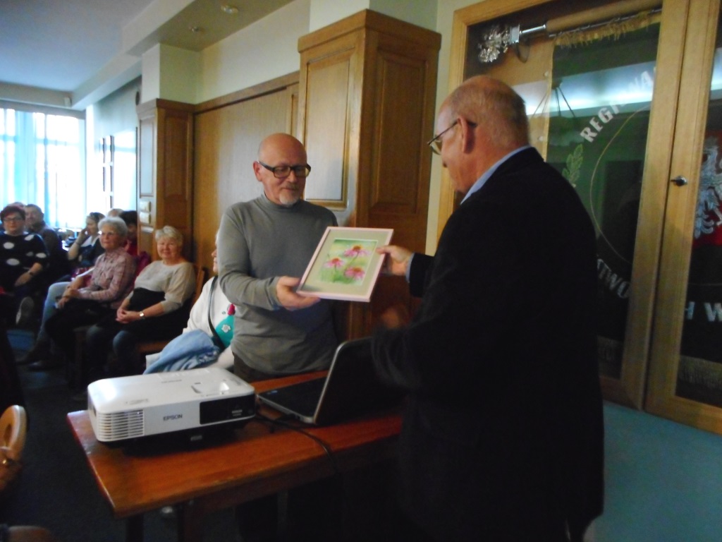 Na pamiątkę wykładu otrzymał akwarelkę namalowaną przez Krystynę Leszczyńską, która też namalowała akwarelę dla Pani Ani Bartoszewicz, która od początku powstania naszego Koła była dobrym duchem wspierającym naszą działalność. Obecnie odeszła na emeryturę i zapisała się do Koła.