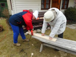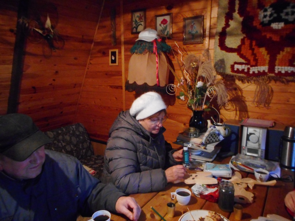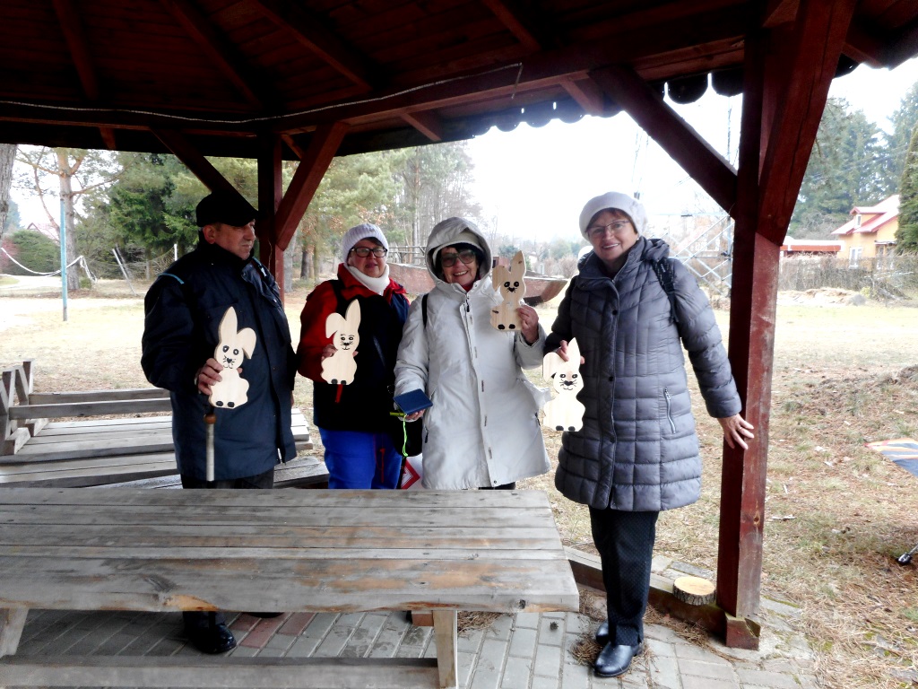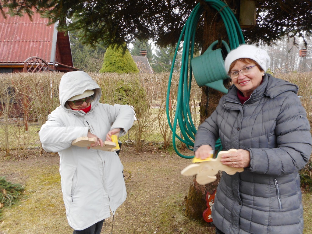 Uczestnicy spotkania na przygotowanych deskach wyrysowali kontury zwierzątek , następnie przy pomocy wyrzynarki elektrycznej wycieli zajączki i wyszlifowali krawędzie papierem ściernym. Kolejnym etapem było malowanie. Podczas schnięcia farby był czas na wypicie kawy i podziwianie efektów twórczych.