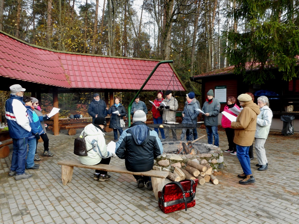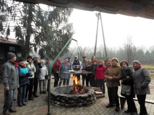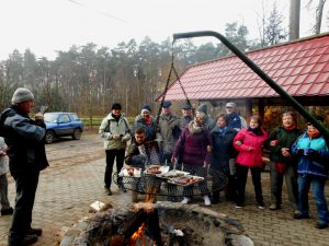 Gospodarzami spotkania byli leśnicy Panowie Roman Schilling i Piotr Laska, który pięknie gra na akordeonie. Przy ognisku, przy akompaniamencie akordeonu, korzystając ze śpiewników przygotowanych przez Rysię i Michała Kłębukowskich, śpiewaliśmy polskie pieśni patriotyczne.