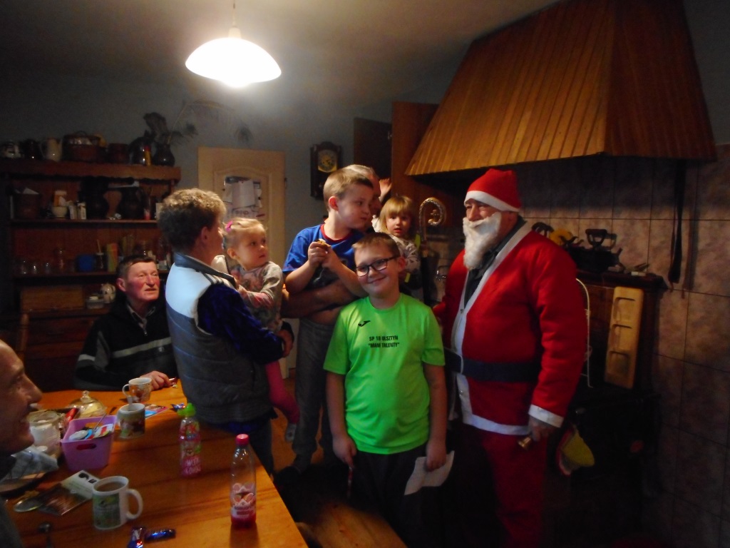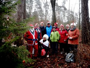 Wiele z tych ozdób zagościło na naszej choince, niektóre takie jak łańcuchy świetlne zdobiły ją na chwilę, inne zostały – mamy nadzieję będą niespodzianką dla ptaszków, może sarenek. A my….śpiewaliśmy kolędy, składaliśmy życzenia świąteczne, a „Nasz Mikołaj” na zaproszenie Szymka Dąbrowskiego odwiedził Rodzinę Wojciecha Dąbrowskiego Leśniczego Leśnictwa Stary Dwór, gdzie złożył życzenia świąteczne, poczęstował słodyczami.