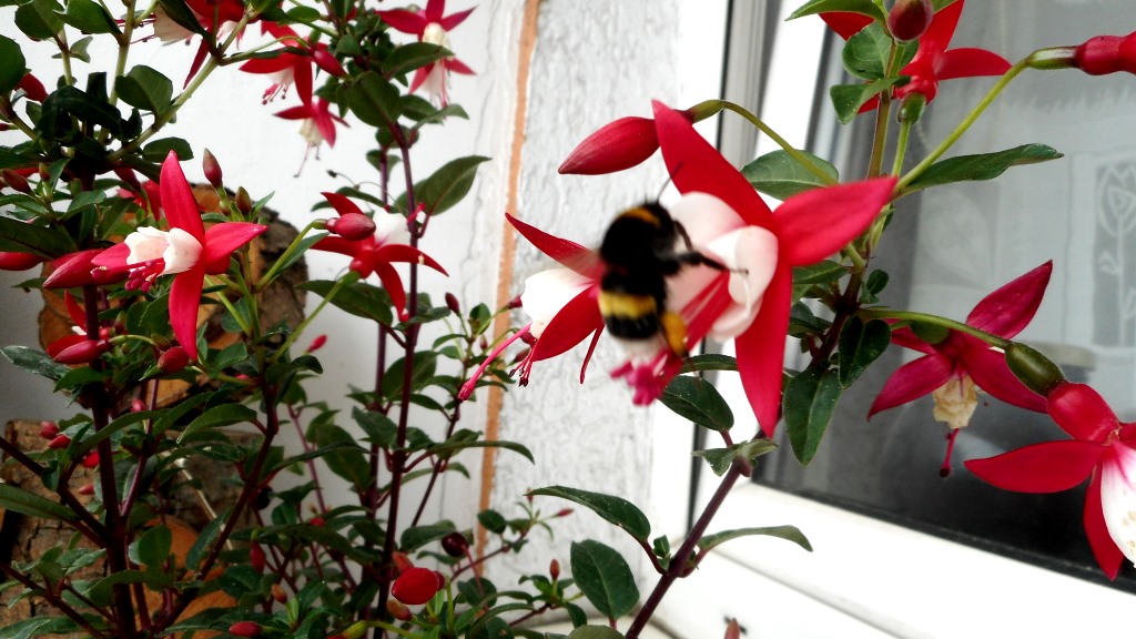 Epidemia – ograniczenie kontaktów? Faktycznie ludzie mniej się spotykają, ale mamy takiego gościa, który odwiedza nas codziennie nawet wielokrotnie. Na początku był zawsze sam ale ostatnio na nasz balkon zaprosił …….. kolegę a może koleżankę ? Posadziliśmy w tym roku dużo różnych kwiatów, ale zauważyliśmy, że najbardziej upodobał sobie niebieską lobelję i kolorowe fuksje. Nie za bardzo lubi pelargonie, aksamitki – a więc te kwiaty, które maja specyficzny zapach. Może coś w tym jest. Najbardziej bawi mnie jak wciska się w kielichy fuksji i widać mu tylko….wiadomo co.