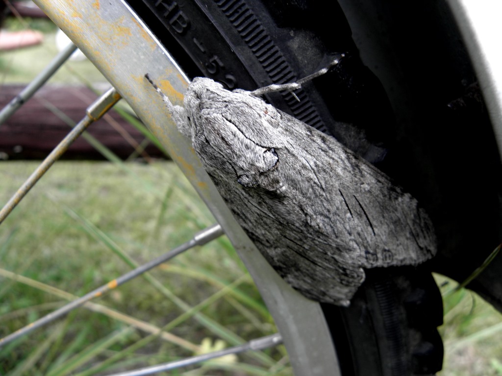 Niedzielne przedpołudnie, jeszcze nie tak ciepło, ale pogodnie, może rowerowy spacer….? A tu niespodzianka ! Na oponie wielka ćma, może ciem? Chyba śpi ? Bierzemy aparaty, jeszcze takich okazów na naszej działce nie było. Chyba trochę za dużo zamieszania………,to coś odlatuje na trawnik, a potem chyba wkurzone, leci do góry i tyle atrakcji. Szukamy, wypatrujemy, ale wśród tylu roślin niestety nie sposób odnaleźć. Może u sąsiadów?………