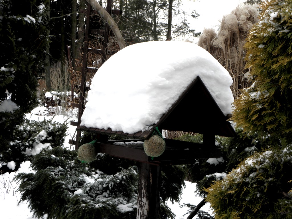 Przymroziło, przysypało, wydawało się, że to może kilka dni, a to trwa i trwa. Coraz trudniej ptakom znaleźć pożywienie, więc pomagamy. „Pyzy” znikają w ciągu kliku dni. Na działce ucztują przeważnie sikorki, ale przed domem, z okna kuchni, obserwujemy wrony, kwiczoły….Część ptaków dobiera się do pyz powieszonych na gałązkach drzew, ale co sprytniejsi bywalcy „stołówki” zbierają na śniegu co spadnie z góry.