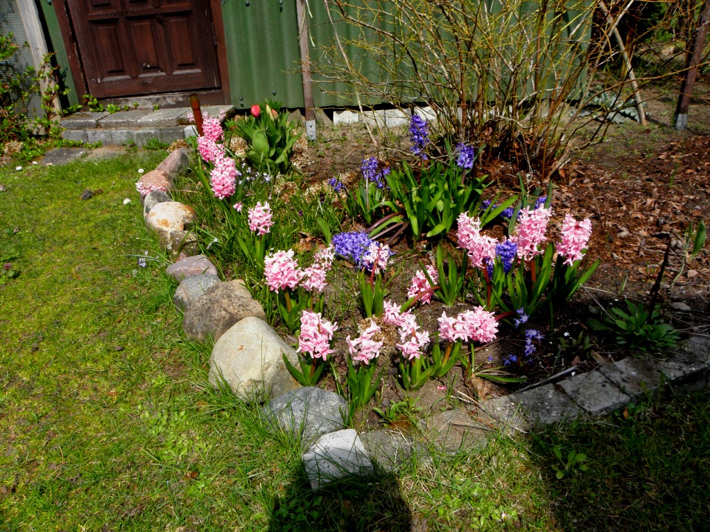 Już nie mieliśmy nadziei, ale zakwitł w maju. Też dobrze. Towarzyszy mu wiele wiosennych kwiatów, które kwitną właśnie w kwietniu, maju…. Jest cudnie, śpiewają ptaki, wiewiórka śmiga po drzewach, co bardzo denerwuje Maksika – pieska naszych sąsiadów………Coś się dzieje. Wróciło działkowe życie. Sąsiadka cieszy się, że nas widzi, my też, mamy fajnych sąsiadów, podziwiamy jak podrosły przez zimę ich wnuki, roznosi się zapach pieczonych kiełbasek……………..