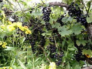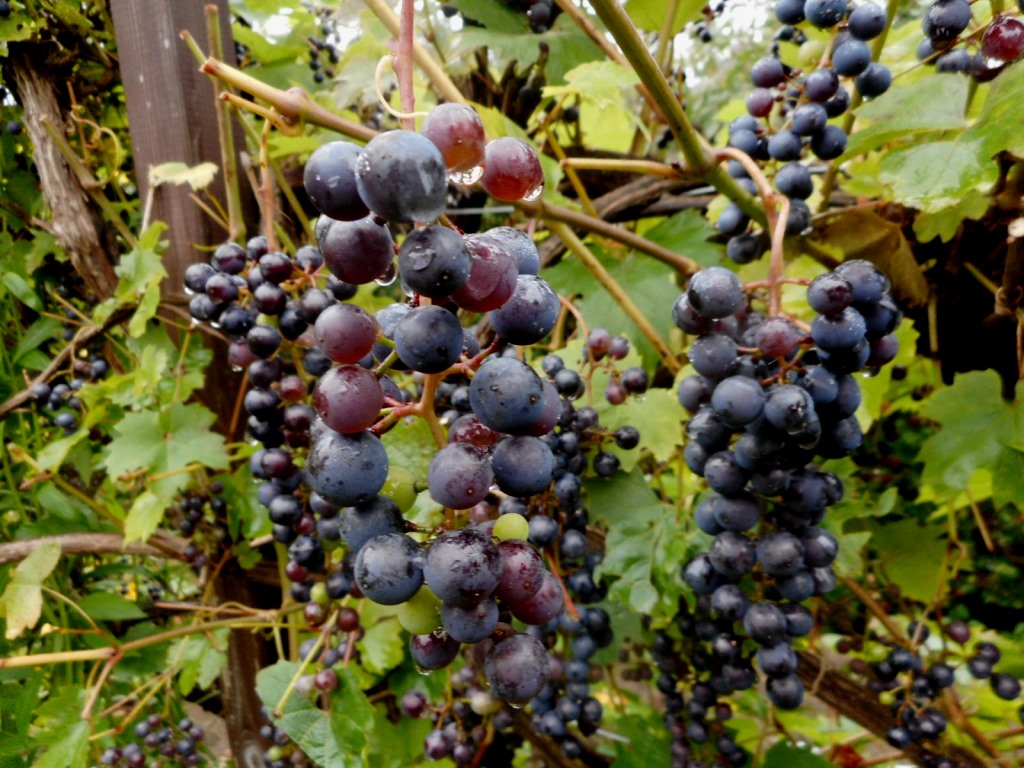 Nie rosną u nas jakieś wymyślne odmiany. Próbujemy bardziej szlachetnych, ale z nimi są same problemy, przemarzną, nie zdążą dojrzeć, albo chorują. Nie stosujemy żadnych chemicznych oprysków, więc …..kochamy te zwykłe małe, ciemne winogrona, które rosną od lat, cieszą od wiosny, gdy pokryją się pięknymi liśćmi, później kwitną, owocują na zielono, aby jesienią przybrać piękny … no właśnie jaki to jest kolor? Fioletowy, a może granatowy? Nie ważne ! Ważne, że są pyszne i że mamy z nich sok na cały rok.