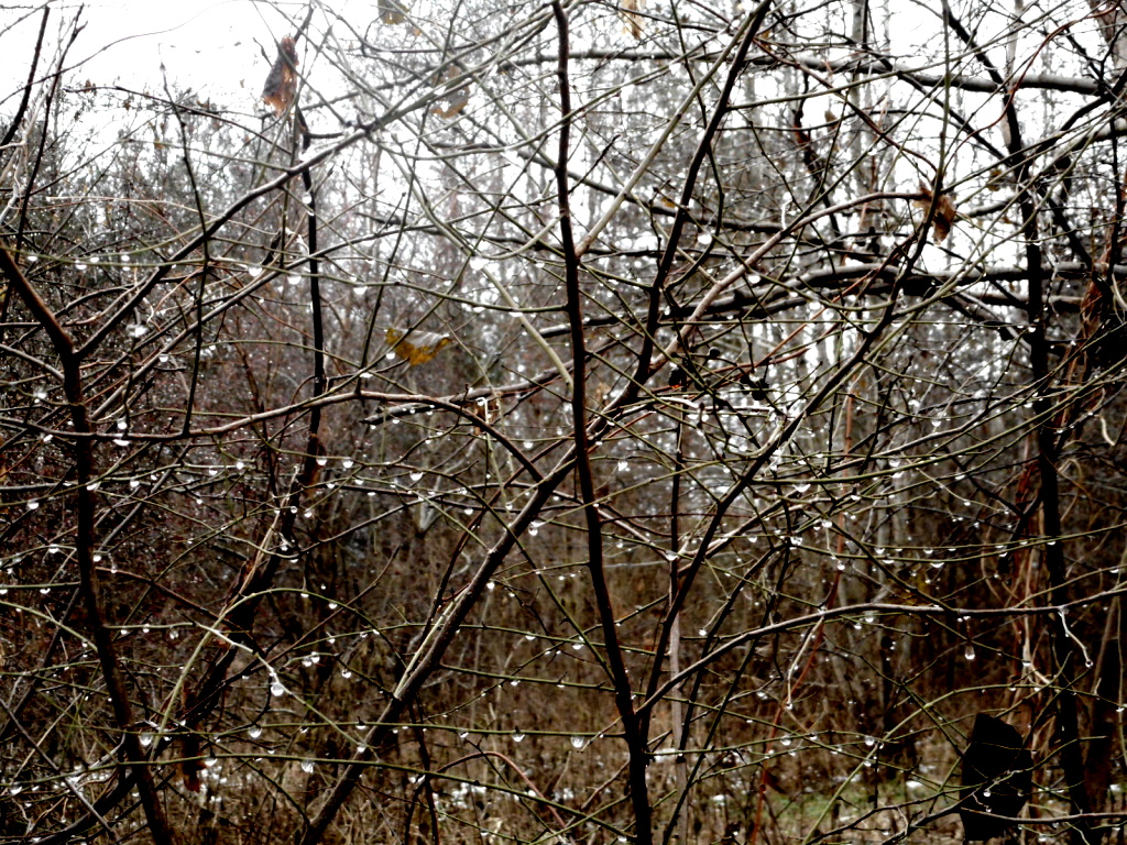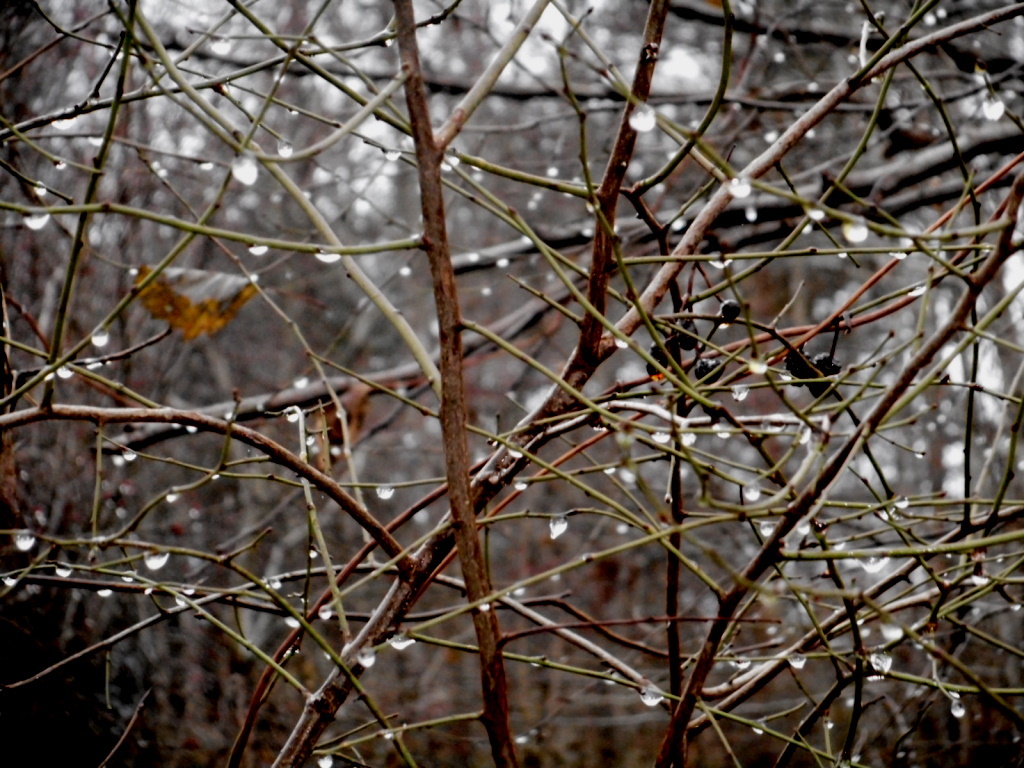 Było biało, czyściutko, wszystko utulone śniegiem …. a teraz ktoś porozwieszał perełki na krzewach…