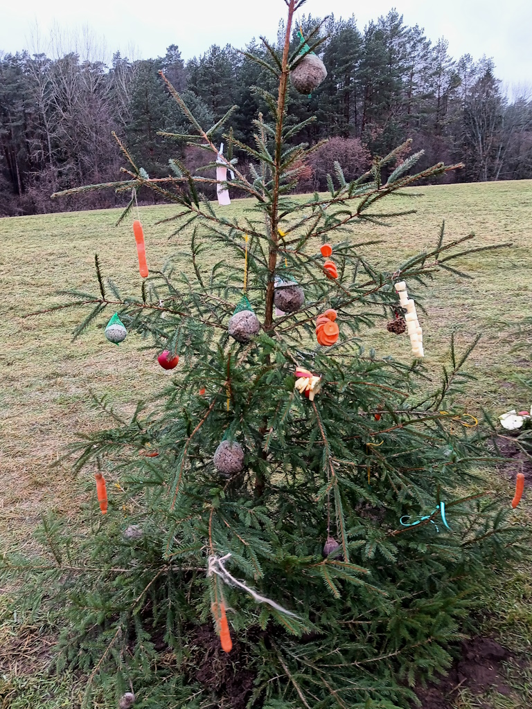 Choinka, która ubraliśmy w „Wojtkowym lesie” – przybrana w marchewki, jabłuszka, kawałki słoniny, w pyzy z różnymi nasionkami – wszystko dla naszych leśnych przyjaciół /zdjęcie Adam Siemakowicz/.