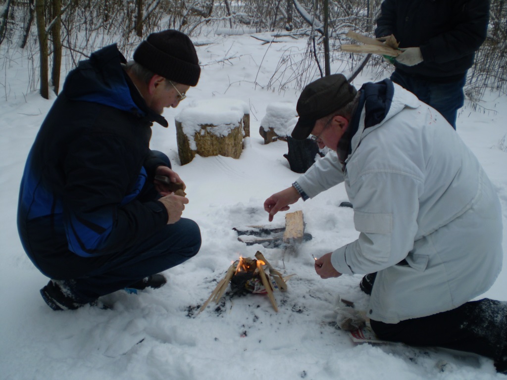 Michał z Józkiem i Grzesiem rozpalili ognisko.