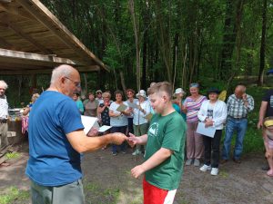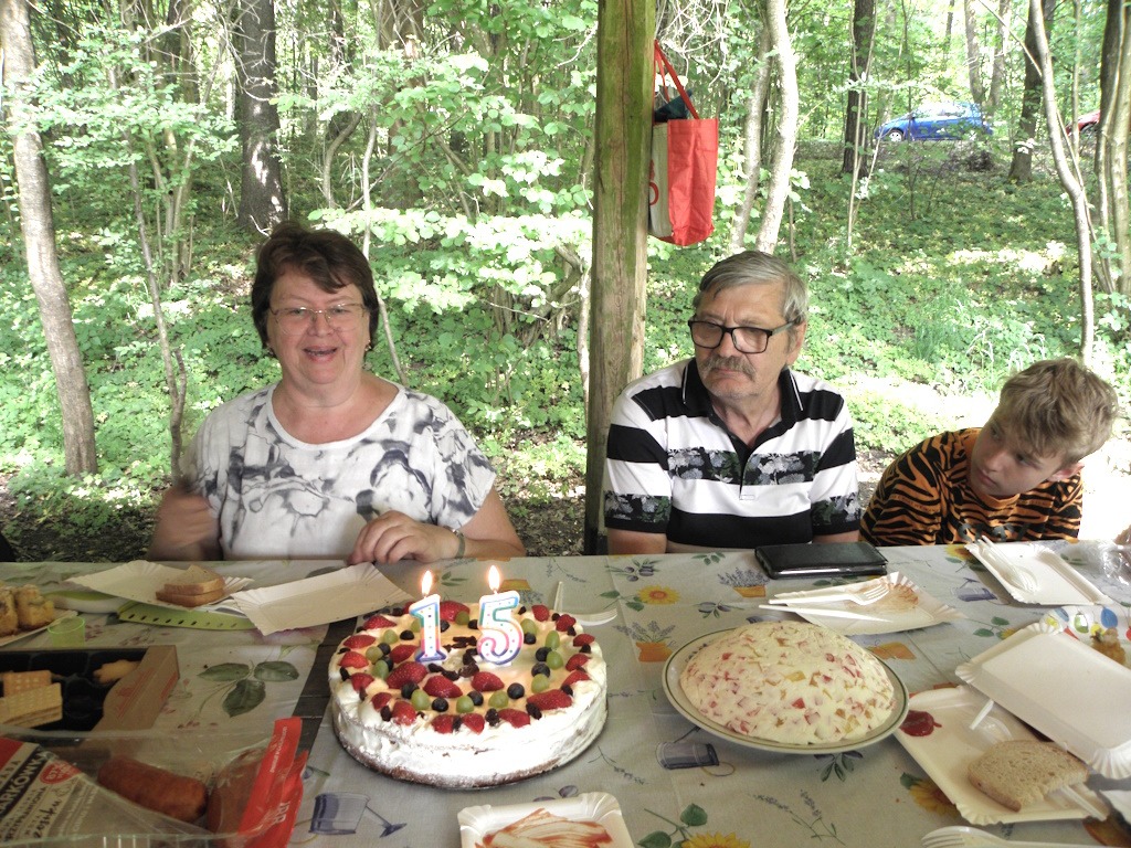 A w tym pięknym słonecznym dniu 25 czerwca częstowaliśmy się przepysznymi ciastami, które upiekły członkinie Koła, w tym Wiesia Filipek, która poczęstowała nas pięknym i smacznym tortem. Było ognisko, kiełbaski, szukanie skarbów w lesie……..jak również inne atrakcje…………….
