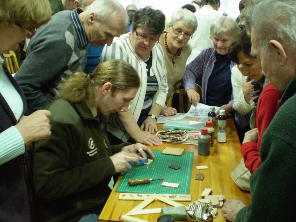 Każdy z uczestników spotkania, a było nas tym razem ponad 70 osób, mógł własnoręcznie wykonać swoje małe dzieło sztuki kaletniczej – breloczki ze skóry.