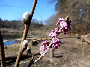 Różowe kwiaty, silnie pachnące, przywabiające zapylające je owady, osadzone są gęsto, zwykle po kilka, w kątach blizn po zeszłorocznych liściach. Kwiaty są obupłciowe, bezpłatkowe, z czterema barwnymi działkami okwiatu. Nektar wydzielany przez kwiaty należy do pierwszych pożytków pszczelich.